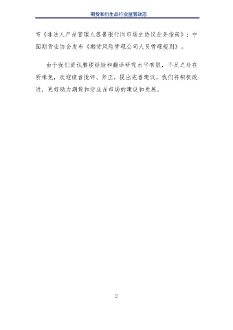 期货和衍生品行业监管动态 布《非法人产品管理人签署银行间市场主协议业务指南》;中 国期货业协会发布《期货风险管理公司人员管理规则》。 由于我们资讯整理经验和翻译研究水平有限,不足之处在 所难免,欢迎读者批评、斧正,提出完善建议,我们将积极改 进,更好助力期货和衍生品市场的建设和发展。 2