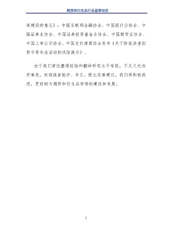 期货和衍生品行业监管动态 道建设的意见》;中国互联网金融协会、中国银行业协会、中 国证券业协会、中国证券投资基金业协会、中国期货业协会、 中国上市公司协会、中国支付清算协会发布《关于防范涉虚拟 货币等非法活动的风险提示》。 由于我们资讯整理经验和翻译研究水平有限,不足之处在 所难免,欢迎读者批评、斧正,提出完善建议,我们将积极改 进,更好助力期货和衍生品市场的建设和发展。 2